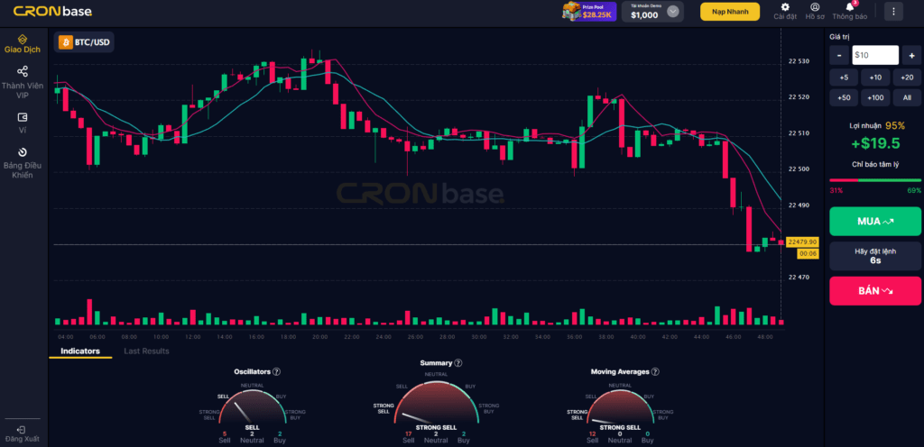 Sàn Cronbase hay còn được gọi là sàn giao dịch nhị phân, có tiền thân là Wefinex. Cách thức chơi rất đơn giản, kể cả người mới cũng có thể chơi. Bạn chỉ cần dự đoán xu hướng tăng hoặc giảm của một cặp tiền tệ đã được hệ thống sàn chỉ định. Sau đó chờ đợi kết quả trong vài giây thông qua báo giá chi tiết từ hệ thống sàn.